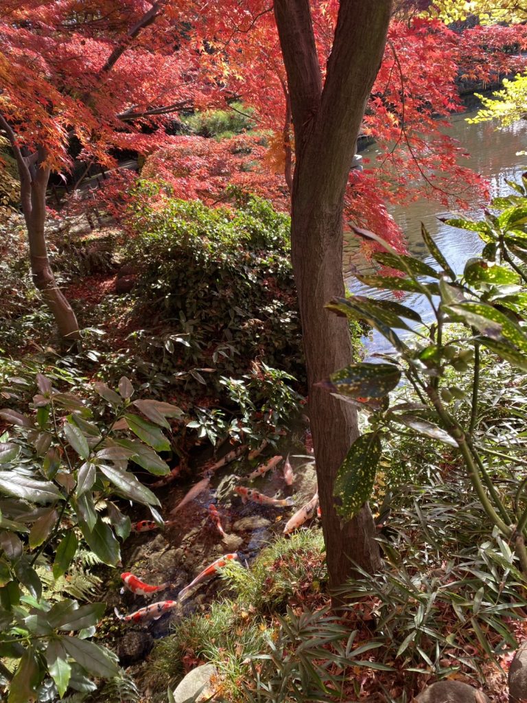特に秋に訪れると紅葉で真っ赤になったもみじが鯉の泳ぐ池に映るのが非常に美しいです。